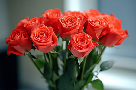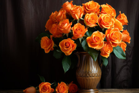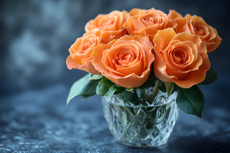 A stunning arrangement of orange roses in a vase with a copy space.