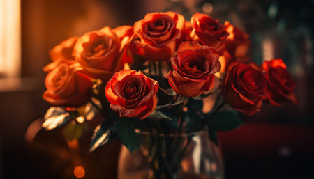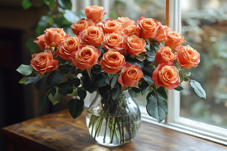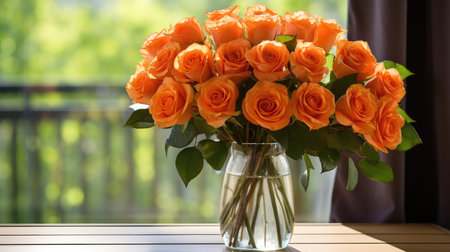 A stunning arrangement of vivid orange roses elegantly displayed in a glass vase, placed on a wooden table by a sunlit window. the lush green leaves add contrast, creating a warm and inviting atmosphere suitable for home or event decor. Generative AI