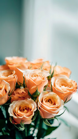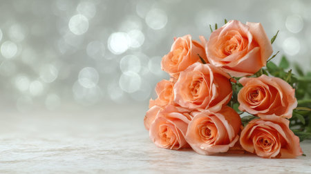 A stunning arrangement of soft peach roses enhances any romantic setting. The blurred silver background adds a touch of elegance, making this perfect for various celebrations.
