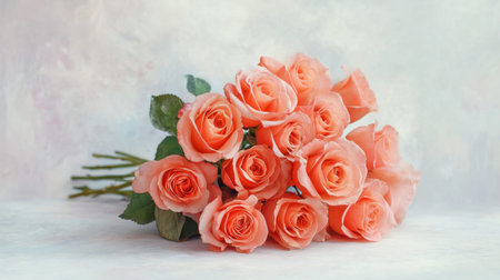 A charming bouquet featuring soft peach roses with lush green leaves against a dreamy pastel background, ideal for love-themed designs and floral decorations.