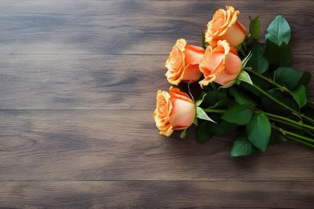 Bouquet of orange roses on wooden background. Top view with copy space