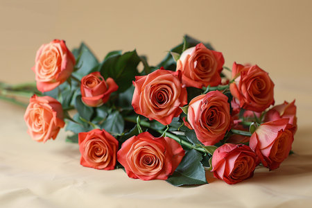 A stunning arrangement of vibrant red roses positioned elegantly against a soft cream background, perfect for romantic themes or floral decor.
