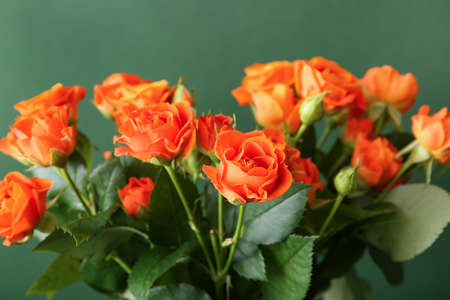 Bouquet of beautiful orange roses on green background
