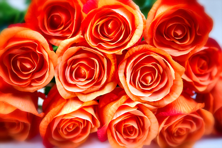 Background of a bouquet of beautiful fresh vivid orange roses tinged with red for celebrating Valentine's, an anniversary, birthday or Mothers Day and free space for text on orange background