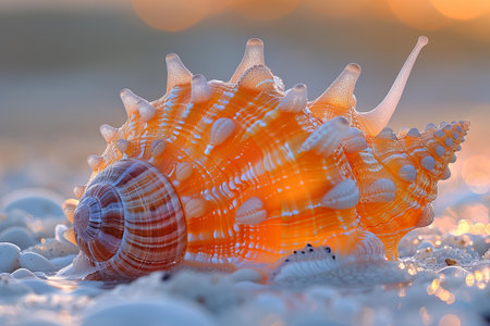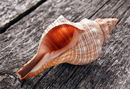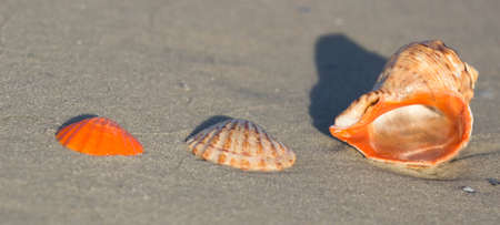 Beautiful rapana shell on the sandy beach. Summer vacation background.