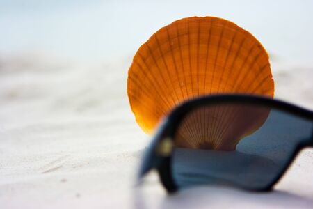 A shell lying on the sand at sunset. Shell on the sand. Maritime theme. Sand on the beach.