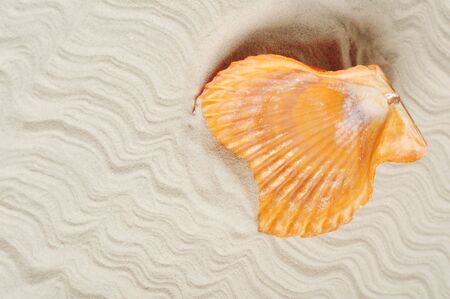 Sea ​​shell lying on the pure yellow sand. Macro. Copyspace.