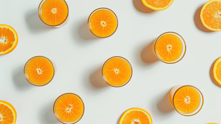 Sliced oranges arranged in a neat pattern on a white surface, showcasing their bright color and juicy texture.