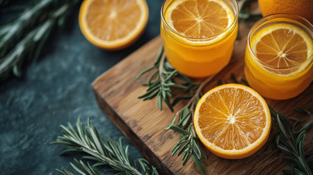 A rustic culinary composition of freshly sliced oranges, glasses of orange juice, and sprigs of rosemary on a wooden surface.