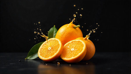 A visually appealing arrangement of whole oranges and sliced oranges showcases their vibrant colors against a soft, sparkling background, emphasizing freshness and health.
