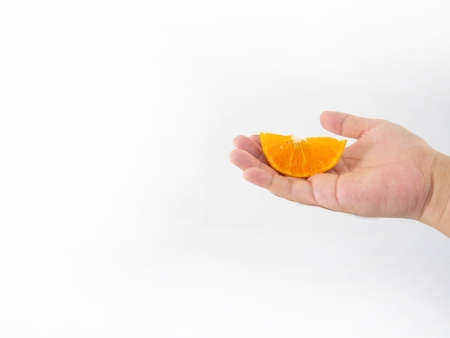 Tangerine in hand on a white background, copy space