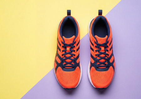 Pair of bright orange and dark navy athletic running shoes, arranged neatly from a top-down perspective on a modern yellow and purple color block surface, ready for sport activity.
