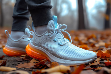 Orange Athletic Running Footwear Shoes On Athlete Feet, Wellness And Sports Activity Concept