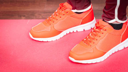 Woman wearing sportswear trainers red shoes, comfortable footwear perfect for workout and training.