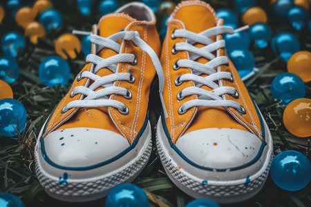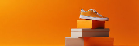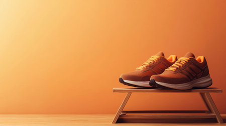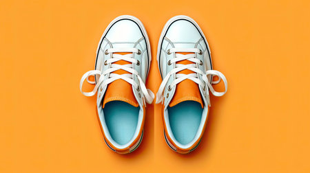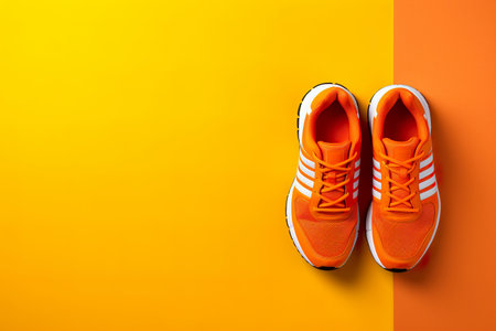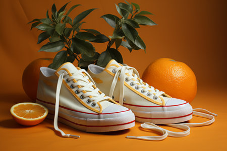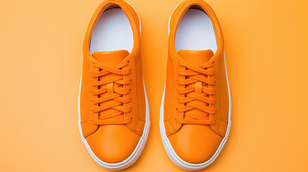 Orange and white sport shoes on yellow background. Close-up view. Empty, copy space for text. Colorful, vibrant footwear, fashion. Active lifestyle, loss weight concept. Generative AI.