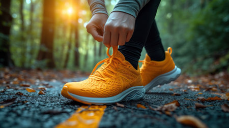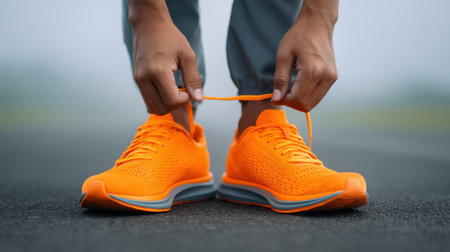A runner focuses on tying their bright orange shoes before hitting a foggy road. The scene captures dedication to fitness and preparation for an outdoor run.