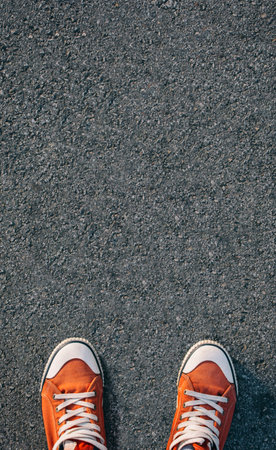 Generative AI : Feet in sneaker standing on pavement background top view
