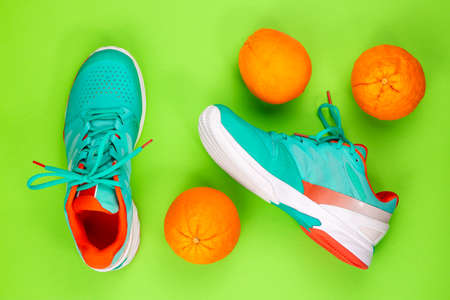 Red, cyan, white pair of new tennis shoes in studio shot over green background with oranges next to them. Directly from above.