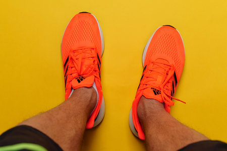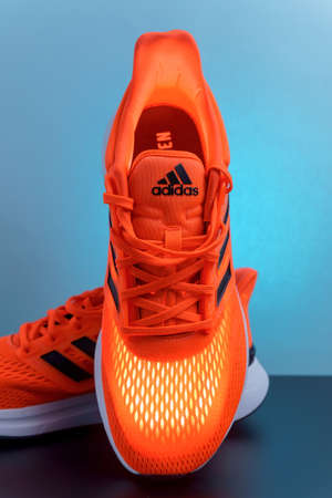 Tyumen, Russia-November 13, 2021: Orange adidas running shoes on a blue background. Vertical photo