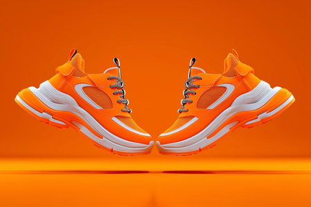 Two vibrant orange sneakers are suspended in the air, showing their unique design against a matching background.