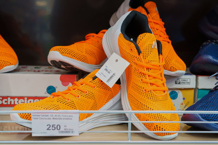 Men's sneakers on the store shelf. Illustrative editorial. April 13, 2022 Balti Moldova