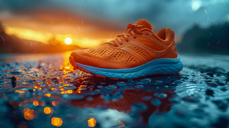 Close-up of vibrant orange running shoes on a wet asphalt road, reflecting the golden hour sunlight.