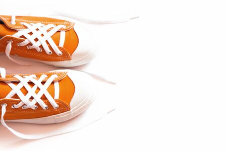 Pair of orange sneakers close up. Female new colored gumshoes isolated on white background. Woman trendy footwear.