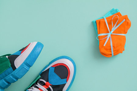 New socks and sneakers. blue background. gift.