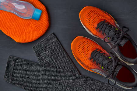 Orange sneakers, an orange knitted hat, warm leggings for sports and a bottle of water on a dark concrete table. Winter running equipment