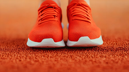 Pair of sneakers worn by athlete standing on track, preparing for athletic competition, symbolizing focus, energy, and physical effort.