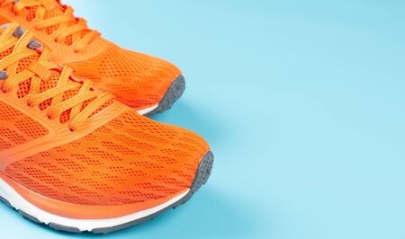 Orange sport shoes on a blue background. Concept for good health.