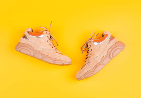 fashionable beige sneakers with laces on yellow background, sport fashion