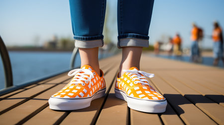 A close up of a person wearing yellow sneakers. Generative AI image.