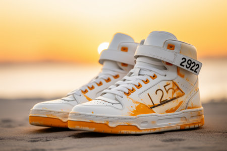 A close-up of vibrant orange running shoes resting on a soft sandy surface. The atmosphere feels energetic and ready for action. The background has a warm, inviting tone.