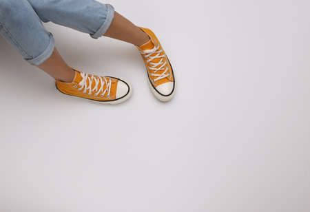 Female legs in jeans and gumshoes on white background. top view. Youth