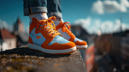 A close-up shot of vibrant orange and blue sneakers placed on the edge of a rooftop, showcasing modern street style against a stunning urban backdrop.