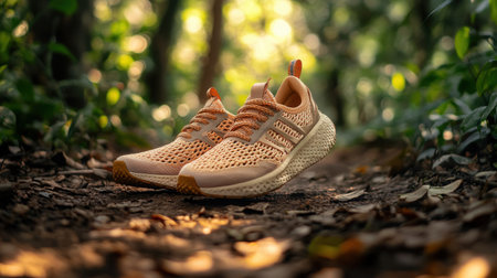 Breathable running shoes are showcased on a manicured trail in a spring park, surrounded by fresh greenery. Ideal for nature lovers and active lifestyles, these shoes combine style and sustainability.