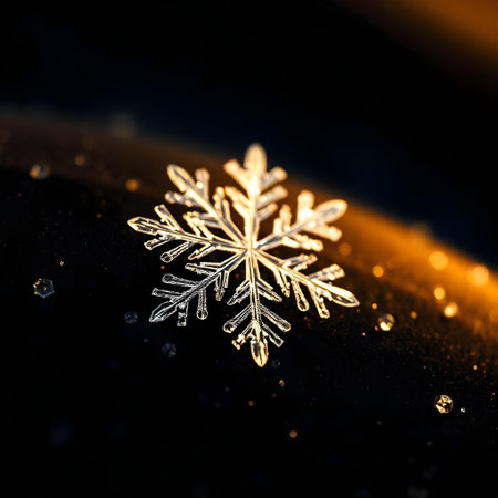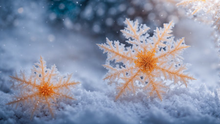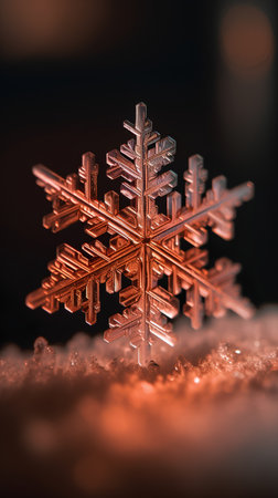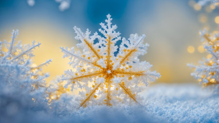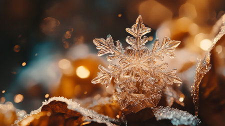 Close-up of a delicate snowflake ornament sparkling on a frosty surface, with glowing golden bokeh lights