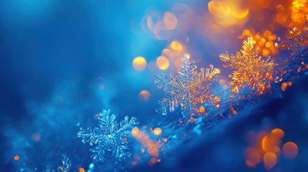 Shimmering snowflakes sparkle amidst a vibrant blue backdrop, accentuated by warm orange lights that evoke a festive atmosphere.