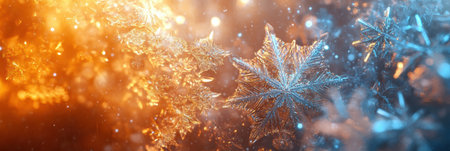 Intricate snowflake shapes shimmer in glowing icy hues, capturing the essence of winter's delicate beauty and frost's enchanting charm.