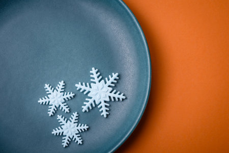 Top view of winter ornament made of white snowflakes on colorful background. Happy New Year concept with copy space.