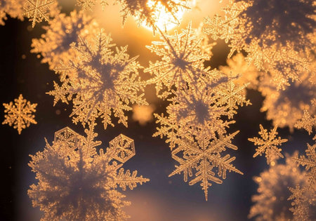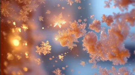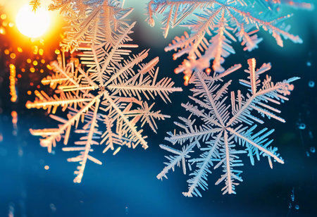 Glistening snowflakes form intricate frost patterns on a window, illuminated by the warm glow of evening light. Winter's beauty captivates with each unique design.