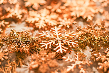 Golden snowflakes falling on a brown background, creating a beautiful and elegant design. The image evokes a sense of winter and Christmas with its delicate snowflakes and soft, shimmering colors.