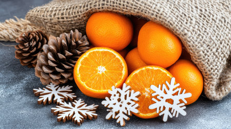Eco-friendly bags filled with tangerine slices and surrounded by pine cones and conifer branches create a festive New Year atmosphere on a concrete table.