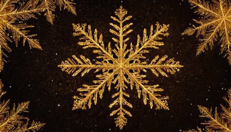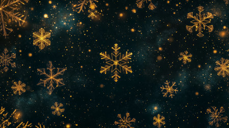 Golden snowflakes on a dark background, creating a sparkling, festive winter holiday design