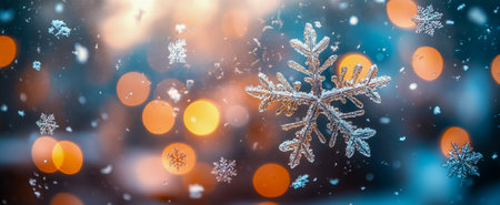 This captivating close-up image features delicate snowflakes resting on a dark surface, enhanced by beautiful soft bokeh lights, ideal for winter themes.