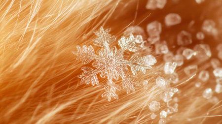 Snowflake on the background of the orange hair. Macro shooting.