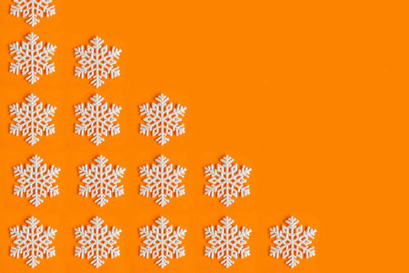 Snowflake pattern at bright orange background. Winter background. Christmas festive background. Copy space