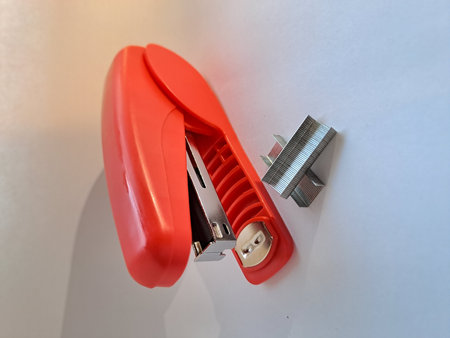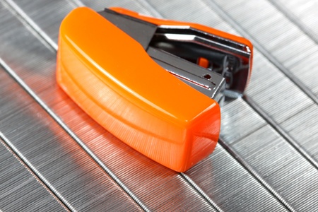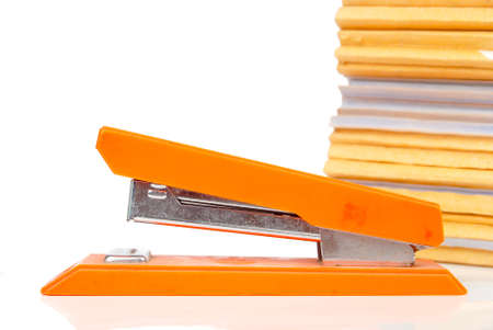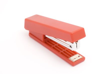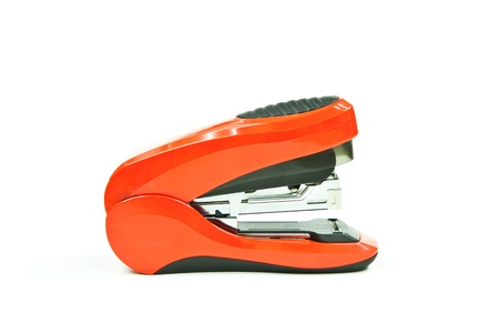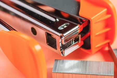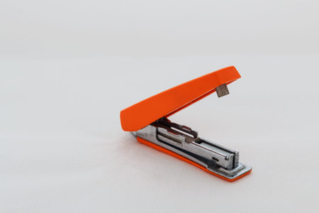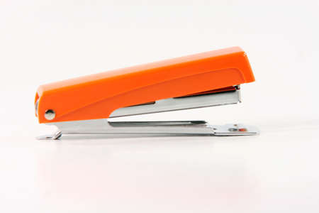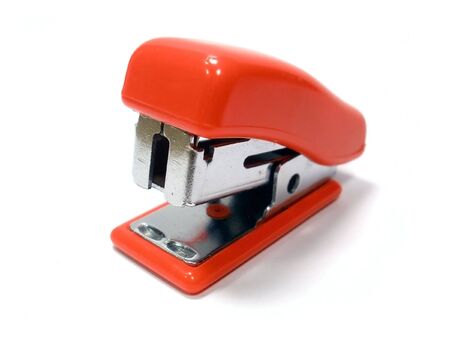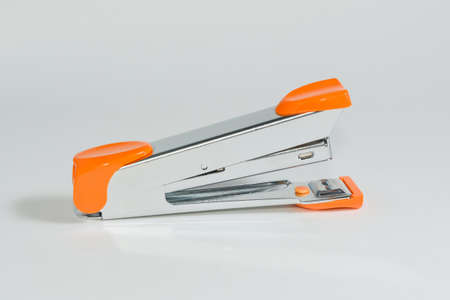 Stapler on white background. Side close-up view of stapler. Orange stapler isolated. Office equipment for paperwork.