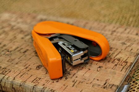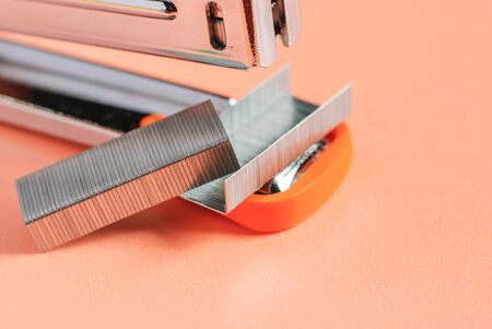 A small orange stapler and staples on a wooden background. Close-up. Copy space. Space for text